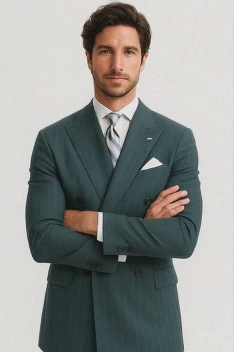 Perfect for weddings, business events, formal dinners, or upscale celebrations, this green pinstripe ensemble is designed for men who appreciate craftsmanship and individuality. The double-breasted construction radiates authority and poise, making it an ideal choice for executives, grooms, or anyone looking to make a strong fashion statement. The hunter green-olive combination gives you a distinctive yet versatile look—ideal for both day and evening wear.