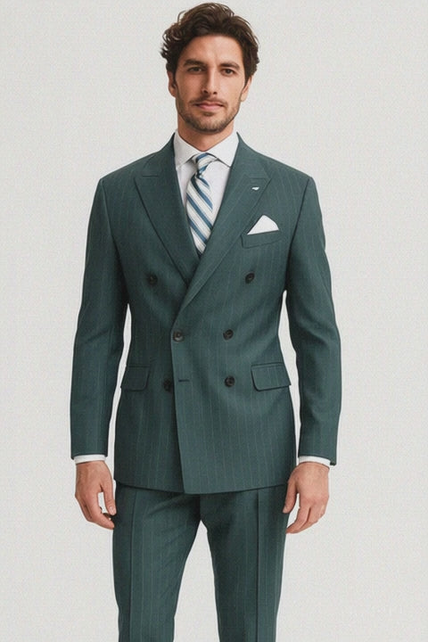 Mens "Hunter Green - Olive Green" Double Breasted Pinstripe Suit - Flat Front Pant