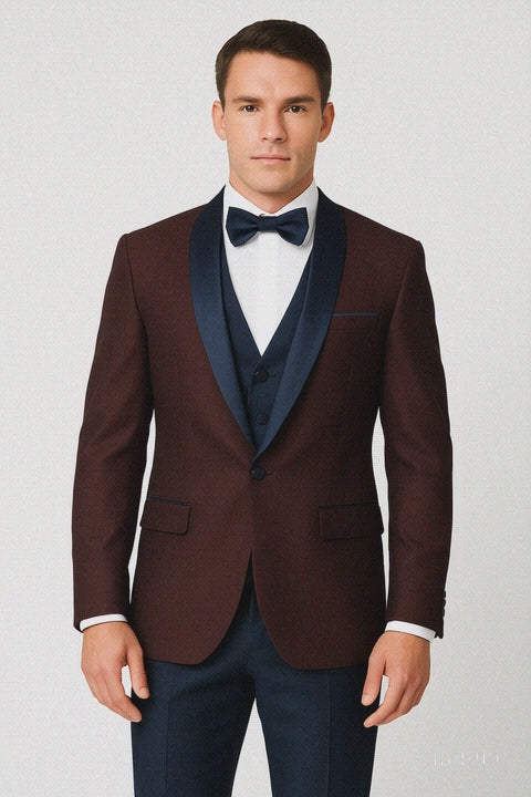 This 3-piece ensemble consists of a single-button burgundy tuxedo jacket, a matching navy blue vest, and tailored trousers — each crafted to perfection with meticulous attention to detail. The burgundy-plum jacket is the centerpiece of the look, featuring a single-button front closure that creates a sleek, elongated silhouette. Its navy blue satin shawl lapel adds an air of sophistication and provides a subtle contrast that enhances the overall depth of the color palette. The design is completed with two front flap pockets, a chest welt pocket with satin trim, and precisely stitched seams for an impeccable finish.