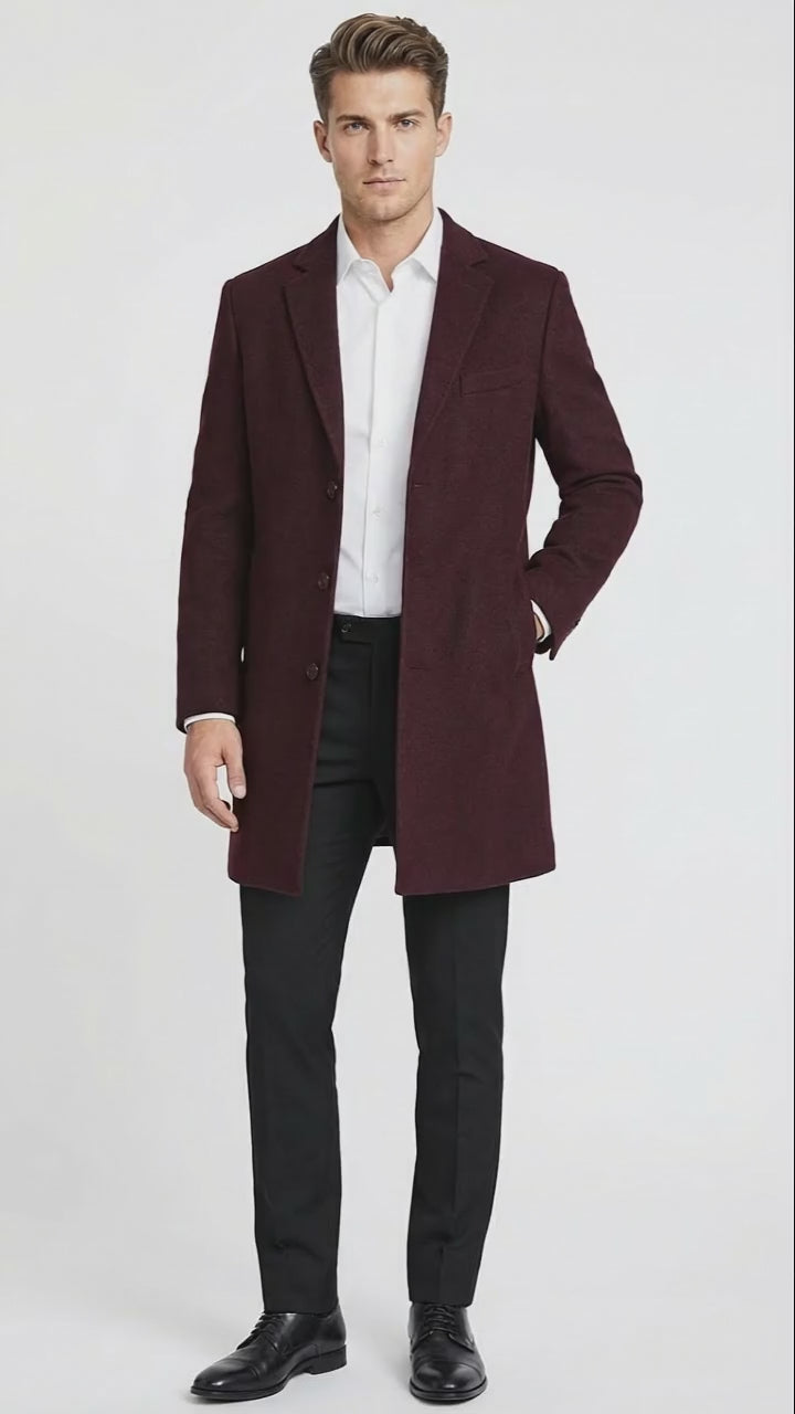 - Burgundy Mid-Length Overcoat – Classic Fit Wool Blend Dress Coat Three Quarter Carcoat Topcoat