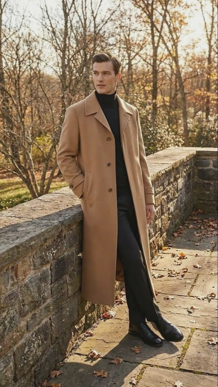 Men’s Full-Length Camel Overcoat – Classic Long Microfiber-Blend Coat for Winter and Formal Wear Maxi Duster Coat
