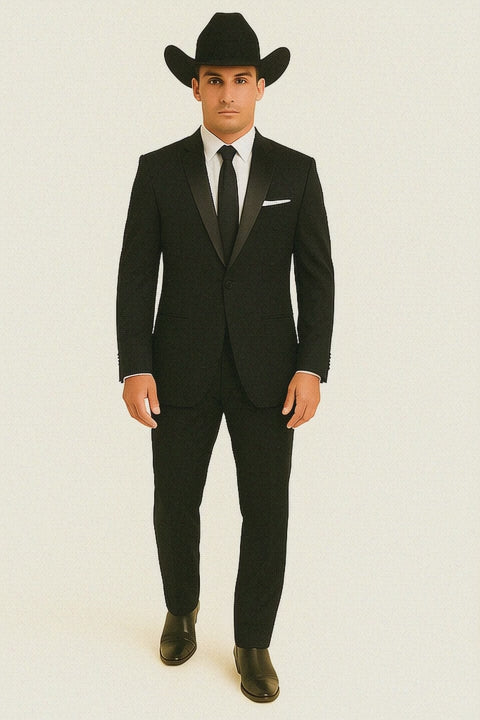 Men'S One Button Slim Fit Solid Black Side Vents Tuxedo Suit With Shawl Lapel