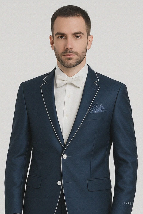 This suit is pure perfection. The dark navy shade is deep and rich, and the white piping adds a sleek contrast that makes it stand out. I wore it to a black-tie event, and people couldn’t stop asking where I got it. The material feels luxurious, and it’s tailored just right — snug but not tight. It’s elegant, versatile, and looks great with both a bow tie or a regular tie. Easily one of the best suits I’ve ever purchased online. - Jonathan L