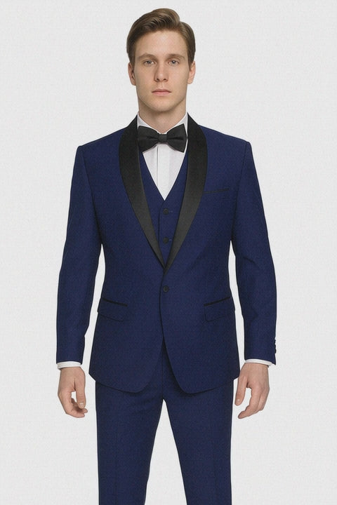 This tuxedo is absolutely stunning! The two-toned blue shades create a bold yet classy look. The black shawl lapel adds sophistication, and the single-button vest completes the sharp style. Perfect for weddings or black-tie events. -Brandon Hayes