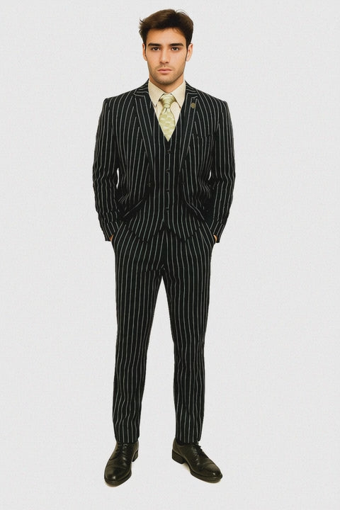 The standout feature of this suit is its classic gangster-inspired pinstripe pattern. The subtle stripes add depth and dimension to the fabric, making it an excellent choice for individuals who appreciate a bold yet understated look. The pinstripe pattern not only enhances the visual appeal of the suit but also creates a slimming effect, accentuating the wearer’s silhouette.