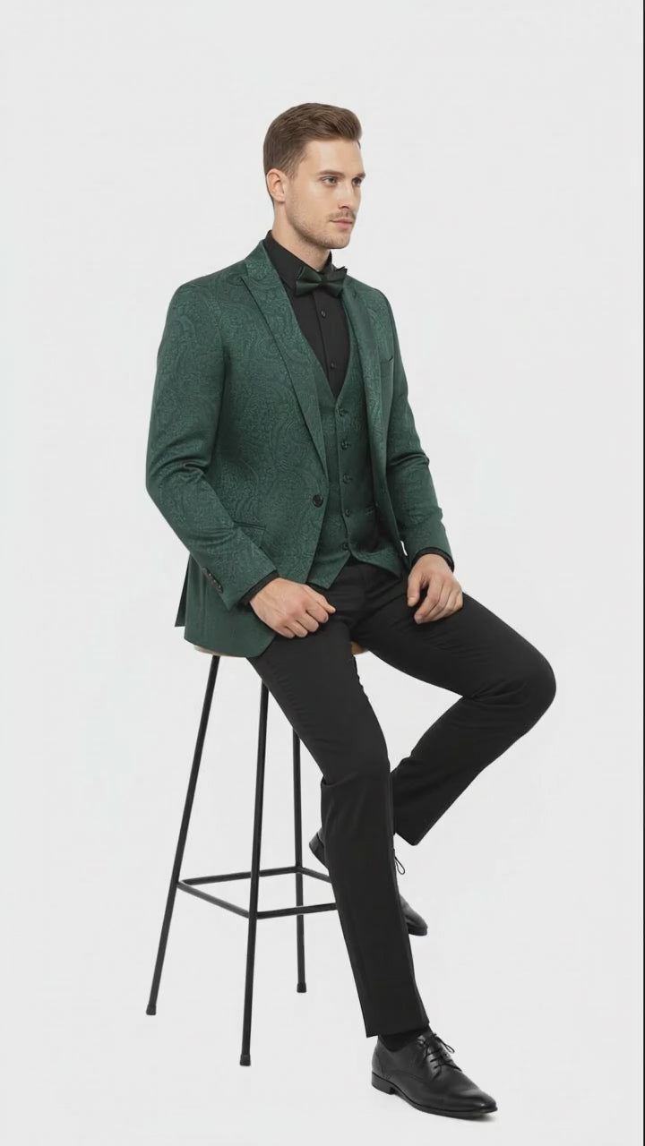 Make a powerful impression with this Men’s Emerald Green 3-Piece Tuxedo Suit, tailored for sophistication and modern charm. This stunning set includes a matching blazer, vest, and pants, all designed with a sleek slim-fit silhouette that defines elegance. The blazer features a subtle paisley pattern that adds texture and luxury, while the deep green hue delivers a bold yet classy look suitable for weddings, proms, formal dinners, and red-carpet events.