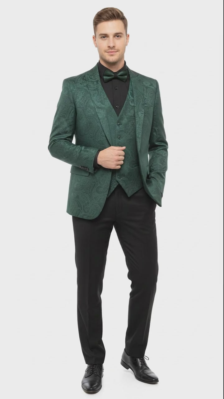 Men’s Emerald Green Paisley Tuxedo 3-Piece Suit – Slim Fit Formal Blazer, Vest, and Pants for Weddings, Proms