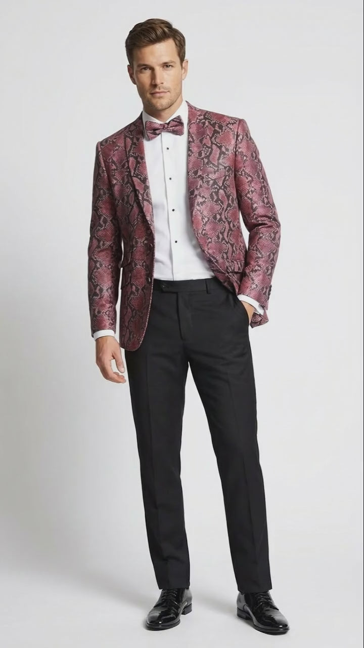 Make a bold fashion statement with this Men’s Burgundy Snakeskin Print Blazer, designed for confident style and standout appeal. Featuring an eye-catching reptile-inspired pattern in rich burgundy tones, this blazer delivers a modern, high-fashion look perfect for nightlife, special occasions, and statement dressing.