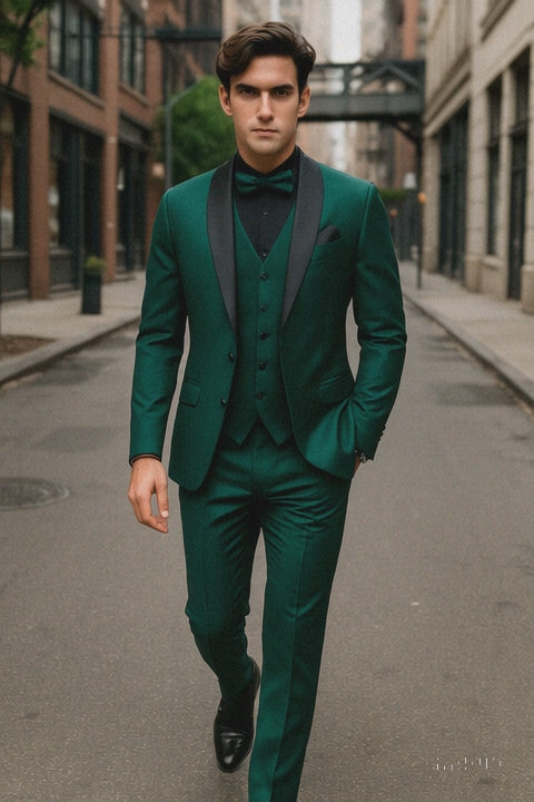 Mens Emerald Green Tuxedo with Black Satin Shawl Lapel – 3 Piece Formal Suit with Vest