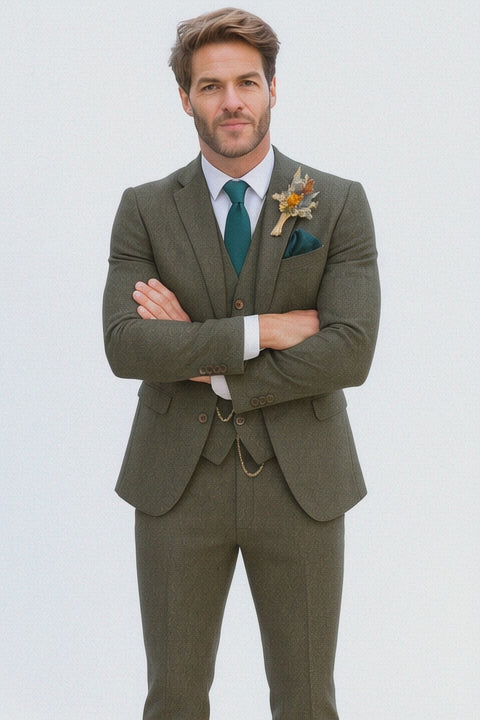 SKU#JA60784 Groomsmen Tweed Suit - Green Herringbone Western Suit - Traje Para Hombre