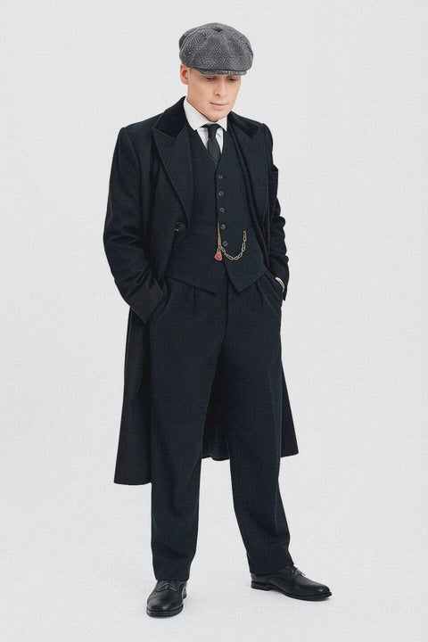Enter a world of sophistication and refinement with the Peaky Blinders Black Suit, a masterful blend of heritage design and modern craftsmanship. Every detail—from the hand-stitched lapels to the precise tailoring—has been thoughtfully created to capture the essence of the modern gentleman. Inspired by early 20th-century British tailoring, this suit pays homage to the timeless style of the Peaky Blinders era while offering contemporary comfort and luxury.