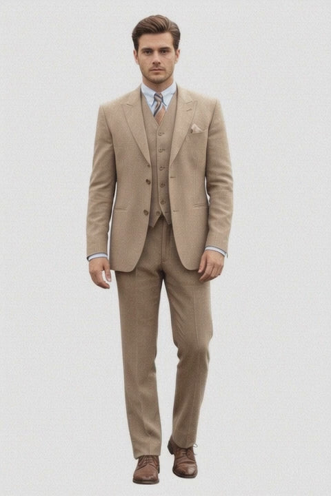 Perfect for themed weddings, stage performances, or formal gatherings, this suit pairs beautifully with leather shoes, pocket squares, and vintage hats. It’s also a favorite among photographers and stylists looking to recreate the nostalgic elegance of old Hollywood. The earthy tan hue flatters every skin tone, while the coffee undertone adds a touch of depth and sophistication that complements both casual and formal accessories.