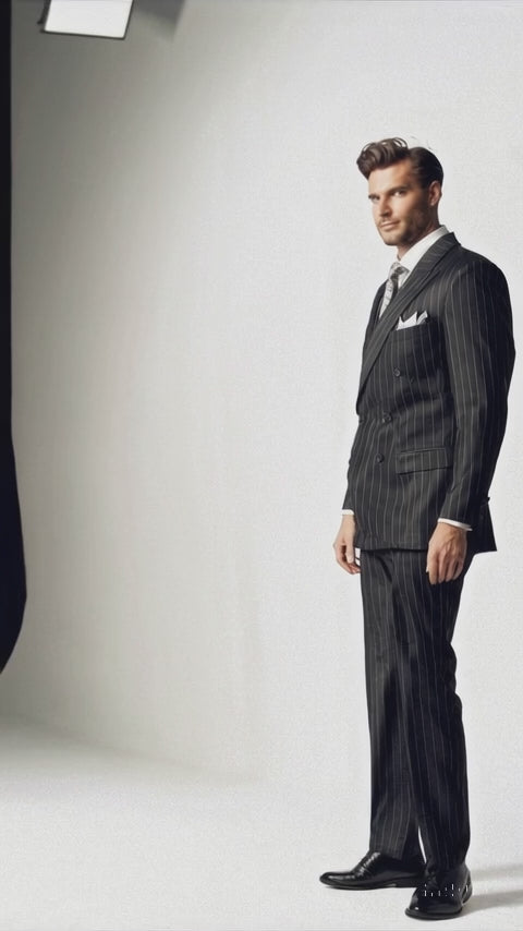 Make a commanding impression with this Chalk Bold Pinstripe Double-Breasted Suit—tailored for the man who means business. Designed in a 6-on-2 button configuration, this suit features a powerful silhouette and bold chalk pinstripes that exude confidence and authority. The Super 120s poly-rayon blend offers a luxurious feel with durability and comfort built in.