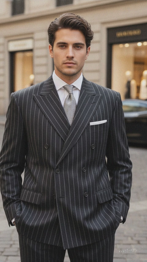 Style: Double-breasted 6-on-2 button front – structured and sharp