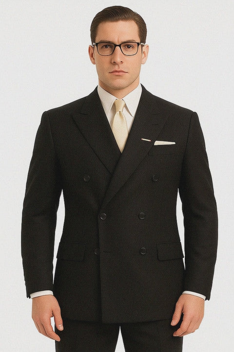 Expertly crafted from premium wool-blend suiting fabric, it features a six-button double-breasted front, peak lapels, and structured shoulders that create a bold, commanding silhouette. The sleek, jet-black tone delivers timeless appeal—perfect for formal occasions, business events, or red-carpet-worthy evenings.