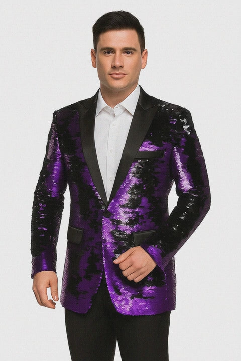 Mens Big and Tall Sequin Blazer - Shiny Fancy Sport Coat + Matching Bowtie + Purple Tuxedo