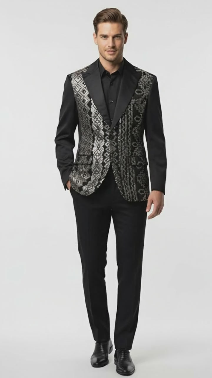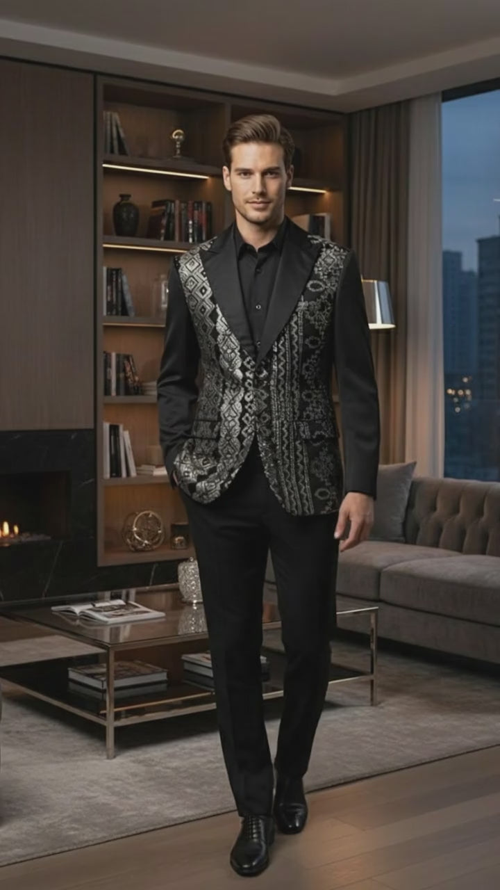 Mens Black and White and Silver Sequin Embroidered Blazer – Luxury Designer Party Wear with Geometric Detailing