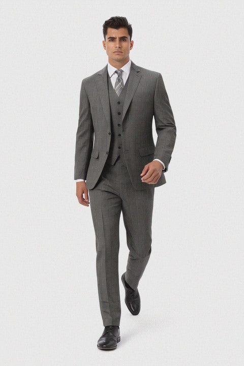 Mens Plaid Suit 2 button Vested windowpane Pant Suit Charcoal - Three Piece Suit