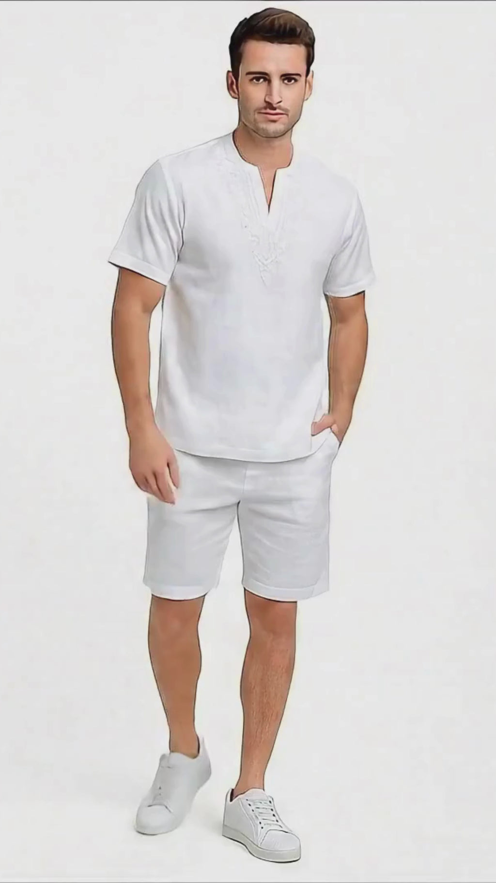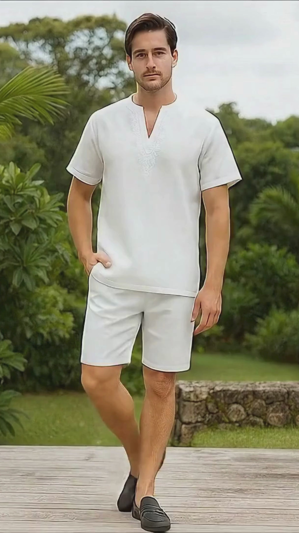 Men’s White Embroidered Short Set – Casual Summer Outfit with V-Neck Shirt and Matching Shorts