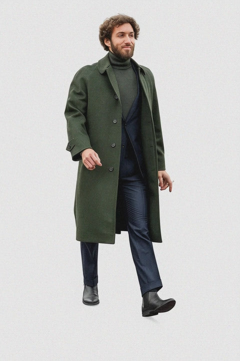 Elevate your cold-weather wardrobe with this Men’s Olive Green Wool Overcoat, the perfect blend of warmth, sophistication, and timeless elegance. Designed for the modern gentleman, this overcoat transitions seamlessly from business meetings to evening outings, ensuring you stay stylish and comfortable throughout the winter season. The olive green wool fabric brings a refined depth of color that pairs effortlessly with both formal and casual looks, making it a versatile essential for any wardrobe.