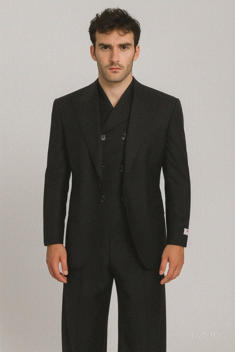 Tiglio Rosso Suit - Classic Fit Athletic Cut 100% Wool Super 150s Italian Fabric Peak Lapel in Color Black