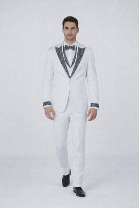 This striking formal tuxedo features a crisp white jacket enhanced with elegant stone accents that add a refined sparkle and visual depth. The stone detailing is carefully placed to reflect light beautifully without overwhelming the suit’s clean and classic aesthetic. This subtle brilliance elevates the tuxedo, making it a standout choice for grooms, performers, and fashion-forward men seeking a polished yet distinctive appearance.