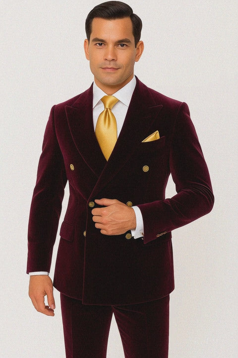The rich raspberry velvet fabric immediately draws attention, offering a sophisticated twist on traditional formalwear. Its soft texture and subtle sheen exude confidence and charisma, while the double-breasted 2-on-6 closure gives the ensemble a regal, structured silhouette. The satin peak lapels add a touch of contrast and elevate the tuxedo’s visual appeal, creating a perfect balance between boldness and classic elegance.