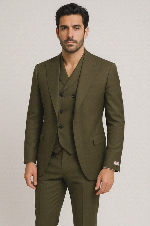 Tiglio Rosso Suit - Classic Fit Athletic Cut 100% Wool Super 150s Italian Fabric Peak Lapel in Color Olive