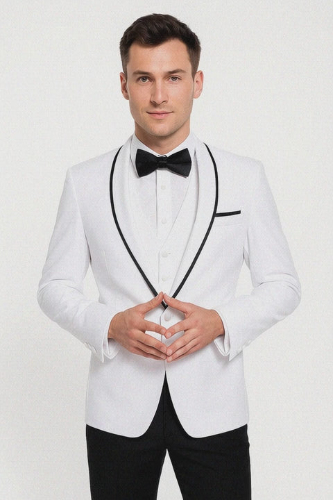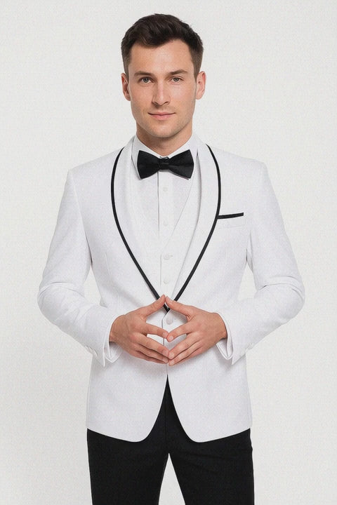 Bring a touch of modern sophistication to your wardrobe with this White Single Breasted Trimmed Sport Coat. Designed with a sleek one-button closure and an elegant shawl lapel, this sport coat redefines classic style with a contemporary edge. Its modern fit offers a sharp, tailored silhouette while still allowing comfort and ease of movement, making it perfect for men who want to stand out with confidence.