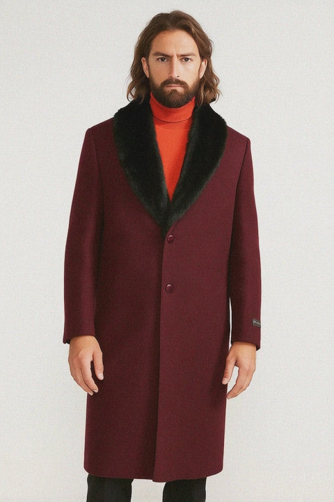 This overcoat is stunning! The burgundy color and fur collar make it look and feel luxurious. — Anthony W.