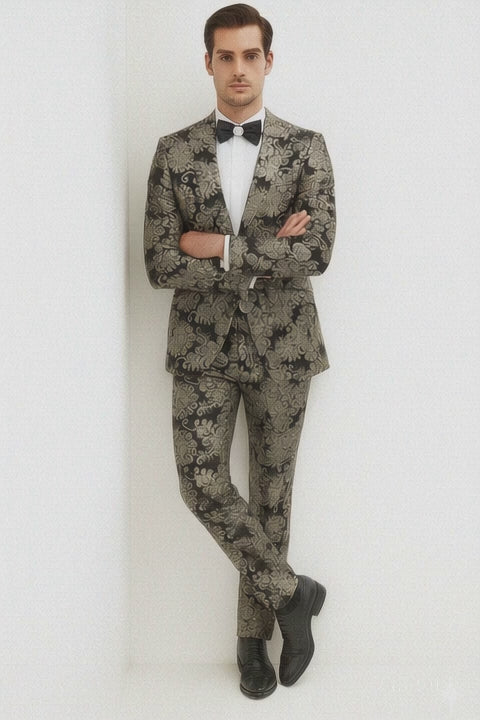 The black base creates a bold foundation that accentuates the brilliance of the gold and silver sequins, while the slim lapel and modern cut add a refined touch. Pair it with a crisp white shirt, a black bow tie, and patent leather shoes to complete your show-stopping look. For an edgier approach, you can style it with a black turtleneck or designer loafers to give it a contemporary twist.