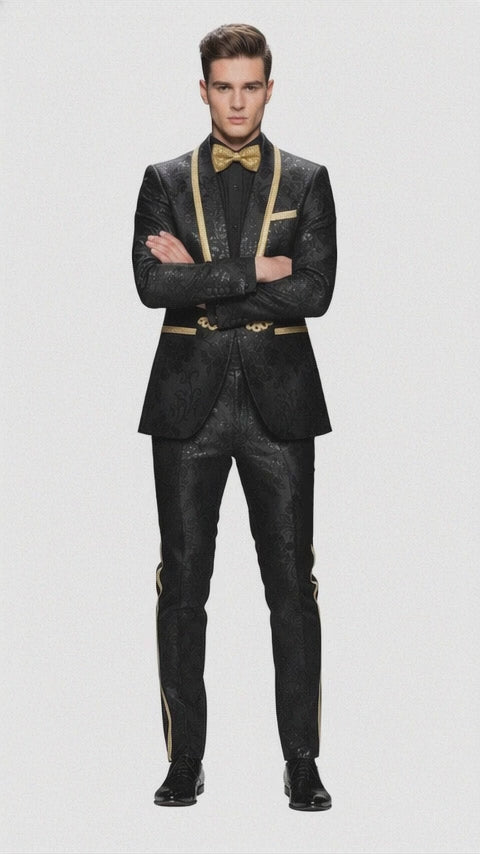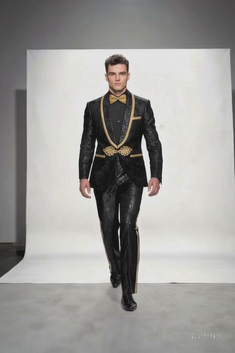 Make an unforgettable impression with this show-stopping black and gold paisley suit—where the richness of gold meets the depth of black in a flawless symphony of sophistication. Perfect for men who dare to stand out and embody elegance, confidence, and modern luxury. Whether it’s for a grand celebration or a formal evening, this suit transforms every moment into a statement of true style.