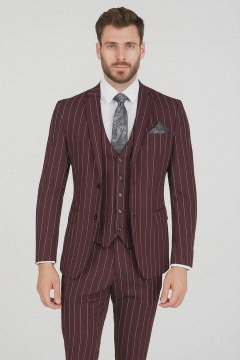 Men's Bold Gangster 1920s Burgundy Suit Vintage Dark Burgundy ~ White Gangster Bold Stripe 2 Buttons Vested Suit Black and Bold White Stripe (MO845)