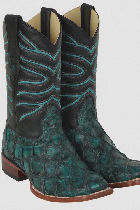 The Rustic Turquoise Pirarucu Boots are a bold expression of craftsmanship and luxury. Made from genuine Pirarucu fish skin, these boots feature a distinctive scale texture and a rich turquoise hue that exudes Western charm with a modern twist. The hand-stitched detailing and durable leather sole ensure long-lasting comfort and style. These boots are designed for men who want to stand out while embracing authentic cowboy tradition.