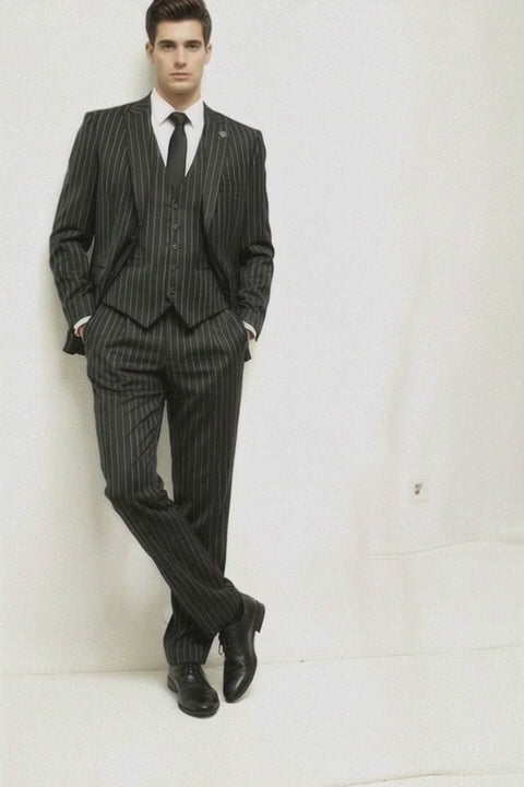 This suit gives off that old-school gangster charm but with a clean, modern fit. The vest adds a classy touch, and the tailoring is perfect — not too tight, not too loose. I received so many compliments at a fashion event I attended last week. The black and white stripes pop beautifully under good lighting. Absolutely worth the investment!-Luca M