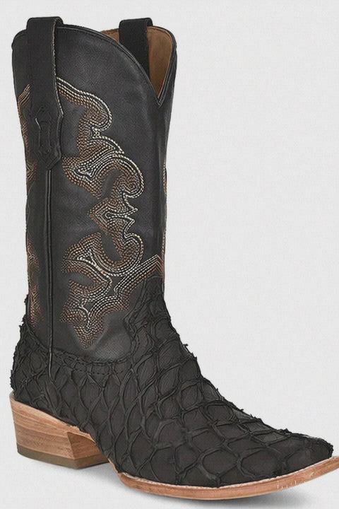 Add a unique and luxurious touch to your wardrobe with these Black Pirarucu Fish Cowboy Boots. A Corral brand classic, these boots are crafted with genuine Pirarucu fish and feature a square toe and leather sole, all expertly crafted in Mexico. Bring your look to the next level with the unparalleled artistry of these one-of-a-kind boots.