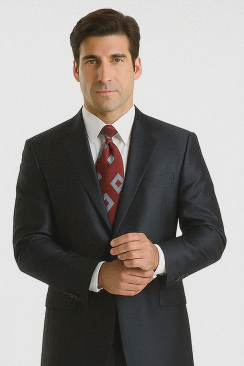 The Dark Blue Sharkskin Suit features a single-breasted, two-button jacket paired with flat-front slim-fit trousers, designed to create a sleek and modern silhouette. The signature sharkskin sheen gives the fabric its distinctive, subtle shine that catches light beautifully from every angle. The jacket includes notch lapels, flap front pockets, and structured shoulders, providing a powerful and refined appearance that complements the confident modern gentleman.