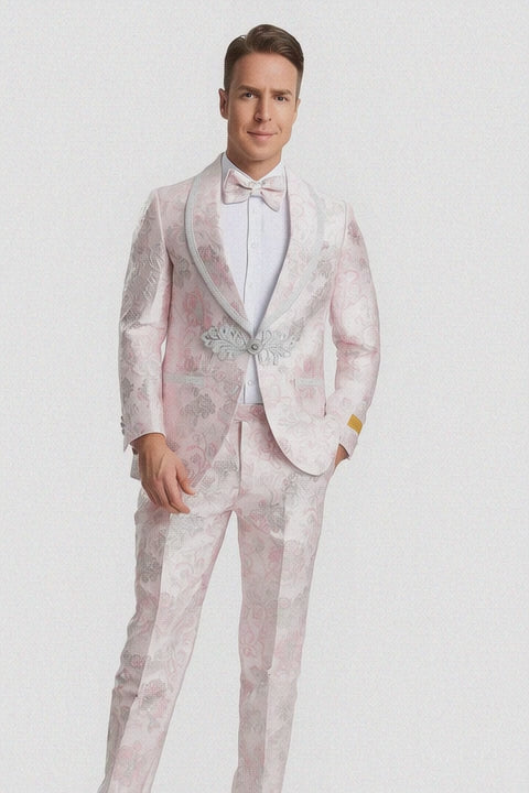Mens Fancy Pink Floral Paisley Prom Tuxedo with Silver Trim