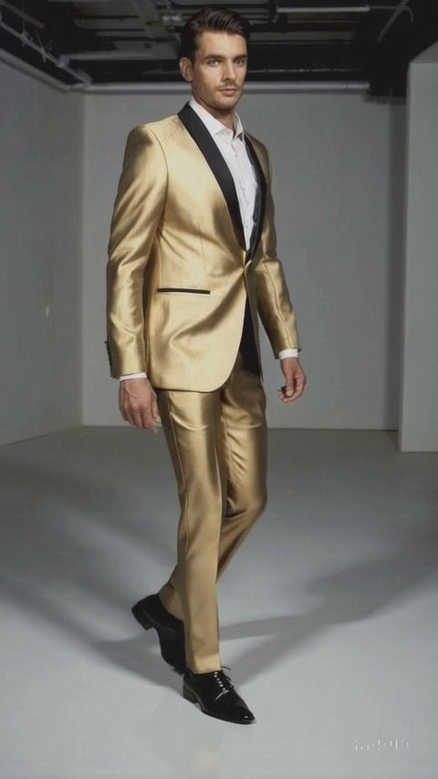 The Men Gold Contrast Lapel Black Shawl Collar 2-Toned Dinner Jacket Blazer Fashion Tuxedo also makes a powerful statement in fashion-forward photoshoots, performances, or luxury dinners where elegance meets charisma. It’s more than just a jacket—it’s a symbol of confidence, success, and individuality. Designed for those who believe in dressing to impress, this piece captures the essence of Italian-inspired tailoring and the allure of modern sophistication.