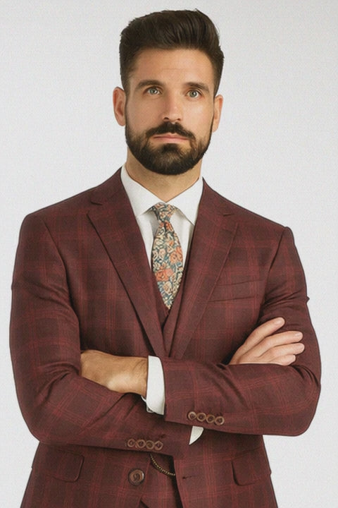 This burgundy plaid suit is absolutely incredible! The maroon windowpane pattern is subtle yet bold, giving it a perfect balance of sophistication and style. The fit is sharp and modern, and the fabric feels luxurious. I wore it to a wedding, and everyone said I looked like a movie star! – Albert T.