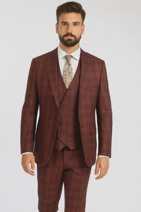 Burgundy Plaid Suits - Maroon Windowpane Suits