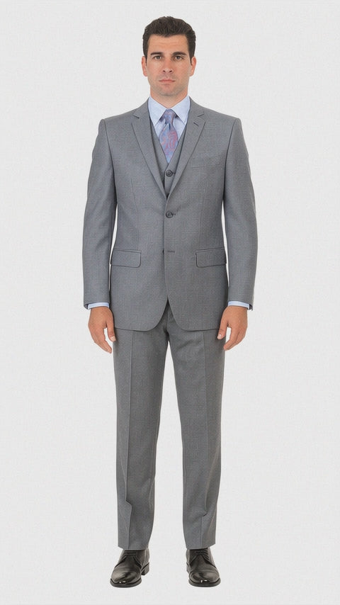 This is a classic 3-piece medium gray suit, designed for men who want a sophisticated, highly professional, and timeless appearance. The suit is made from a smooth, fine-textured fabric that drapes cleanly and gives a polished finish suitable for formal and business settings.