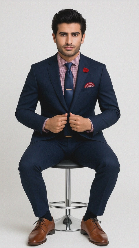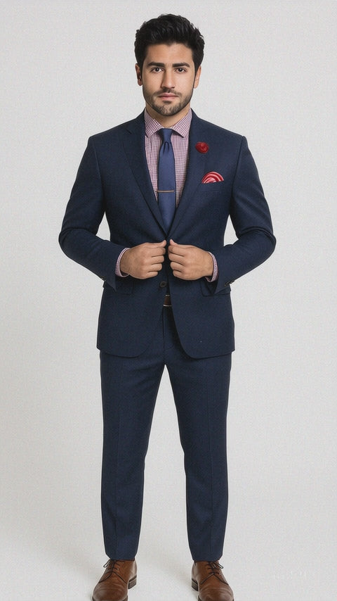 This is a premium slim-fit navy blue two-piece suit designed for men who want a clean, modern, and stylish look. The jacket features a tailored silhouette with sharp shoulders, a structured chest, and a narrow waist to enhance your frame. It comes with a two-button closure, notch lapel, and a subtle sheen that adds sophistication without being flashy.