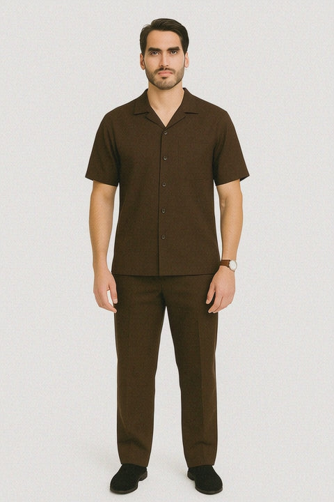 Mens Linen Suit - Mens Collared Button Closure Brown Short Sleeve Shirt Walking Leisure Suit