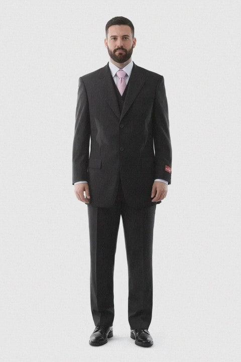 Men's Superior 150s Extra Fine Black 3 pcs Vested Suits with Peak Lapel