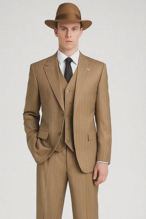 Mens Tan Pinstripe Zoot Suit – 1920s Gangster Vintage 3-Piece Suit with Wide-Leg Pants