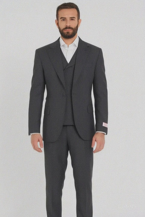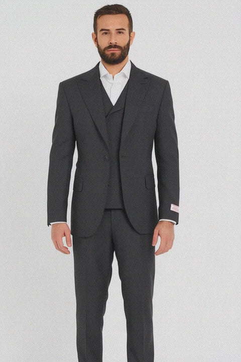 Wide leg Suits - Classic Fit Suits - Athletic Fit Suits 1 Button Vested Suits - Wool Charcoal Suits