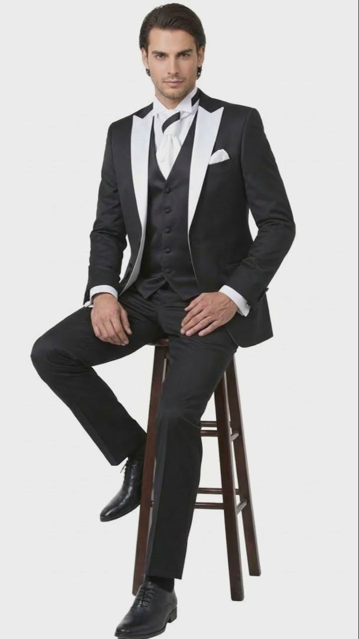 Men’s Black and White Lapel Prom Tuxedo Suit + Black Vest + Black Pants Peak Lapel