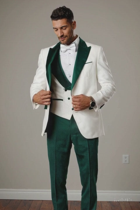 Men’s White Paisley & Hunter Green Tuxedo – Designer Vested Wool Suit for Wedding & Prom