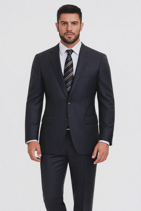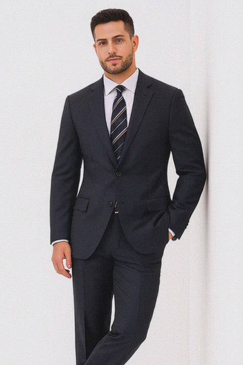 The flat-front trousers complete the ensemble with a tapered slim silhouette, providing a sharp and contemporary finish. Designed with precision, the trousers maintain a perfect crease and sit comfortably at the natural waistline. Whether styled with a crisp white shirt and silk tie for professional settings or with a turtleneck for modern appeal, this suit delivers versatility and sophistication in every setting.